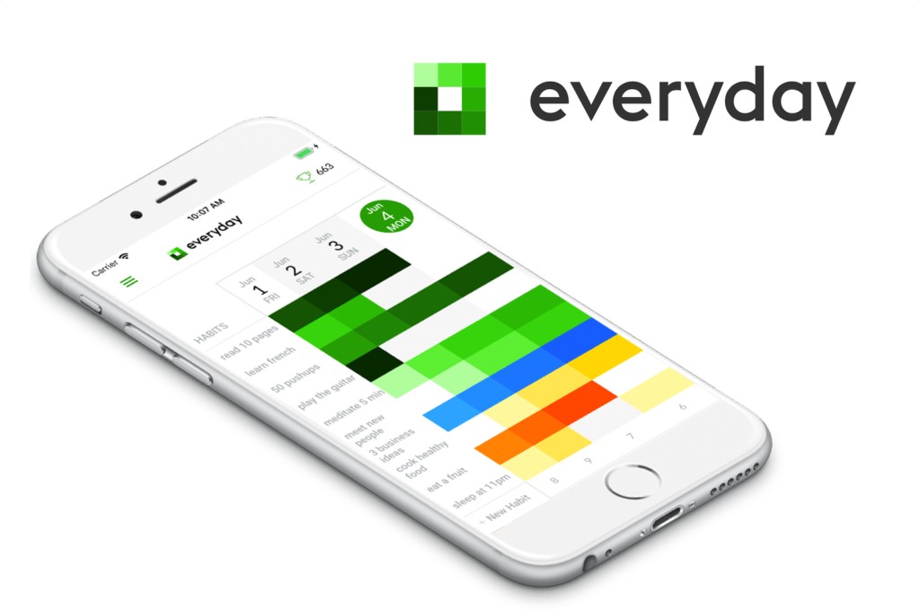 Everyday app interface on iPhone showing habit tracker grid with colored blocks Everyday is a beginner-friendly, cross-platform habit tracker that focuses on simplicity and visual motivation. Its clean interface presents progress in an easy-to-understand visual chain, helping users clearly see their growth and stay motivated through consistent feedback. The app supports the “Make it Obvious” and “Make it Satisfying” principles by turning habit tracking into a visually rewarding experience.